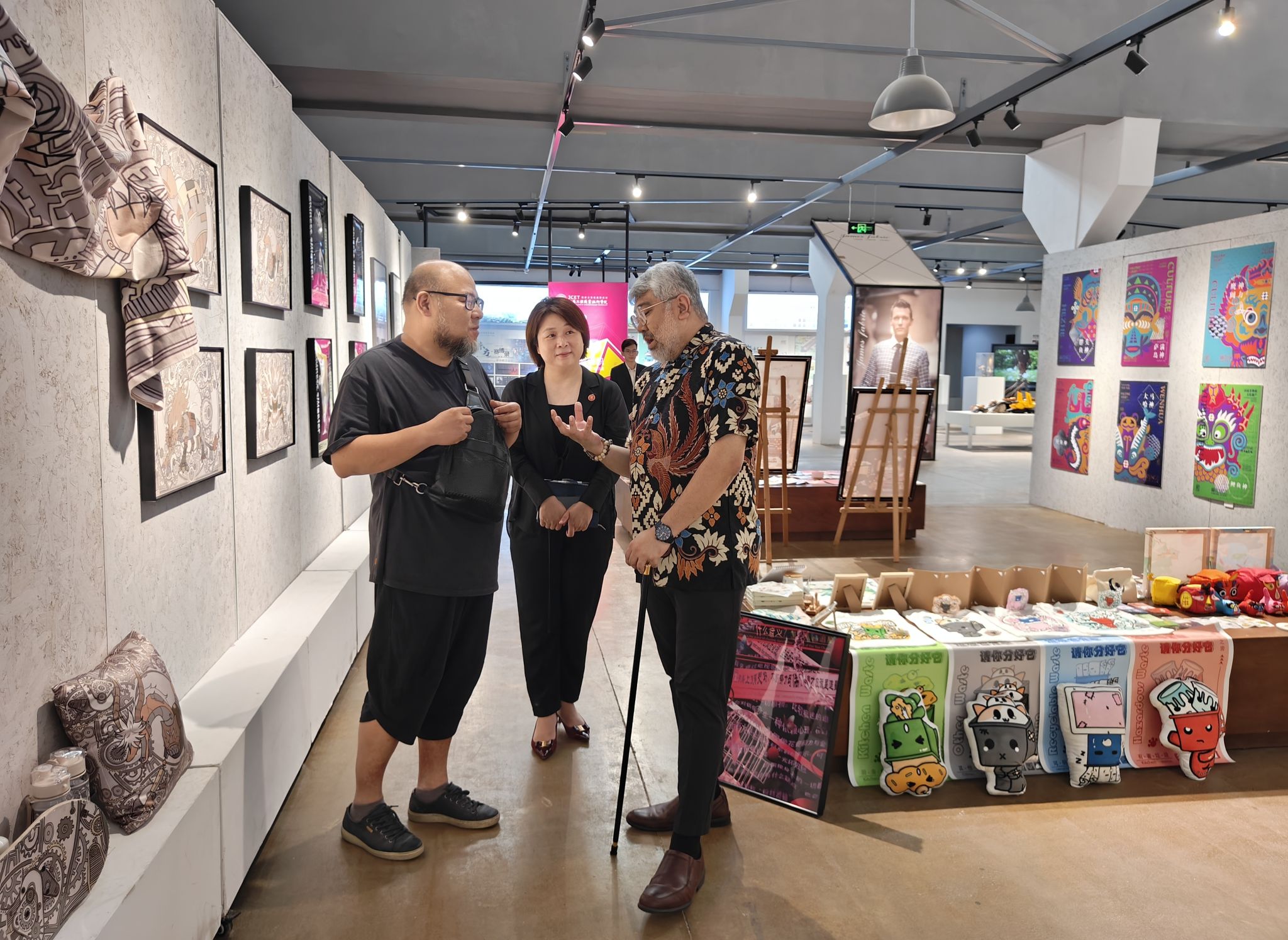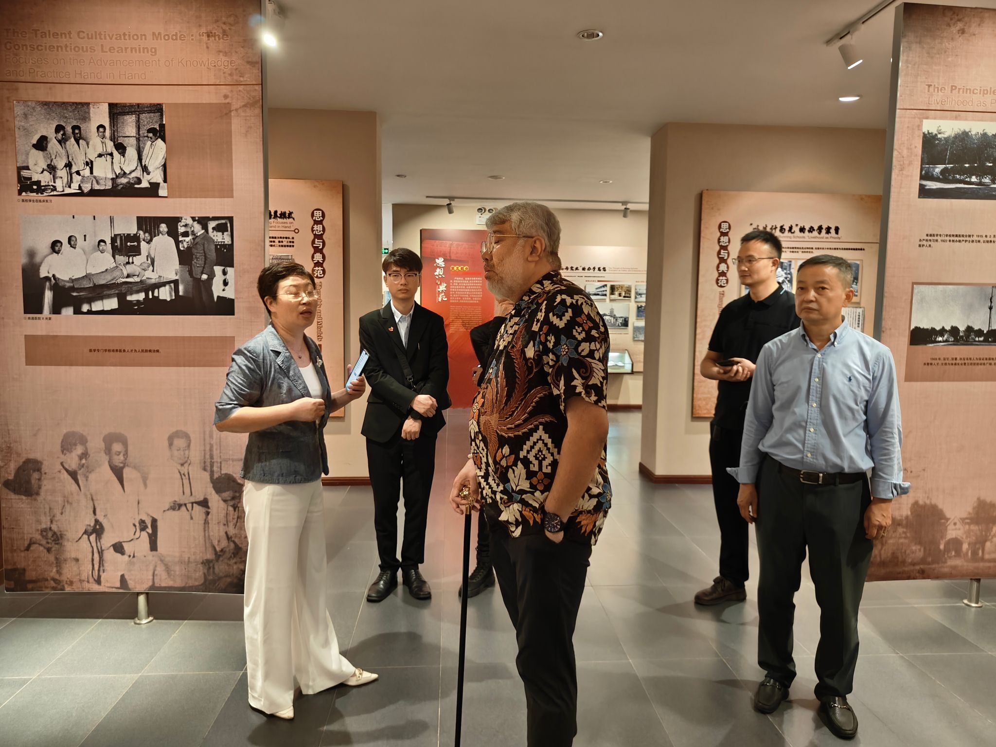 会谈结束后,来宾饶有兴致地观摩了艺术设计学院2023届毕业生作品展,艺术设计学院院长任健通过学生作品向来宾展示了学校的人才培养理念和南通区域经济发展现状。来宾还参观了学校文博馆,了解我校悠久的办学历史和创始人张謇先生“父实业而母教育”的思想内蕴。