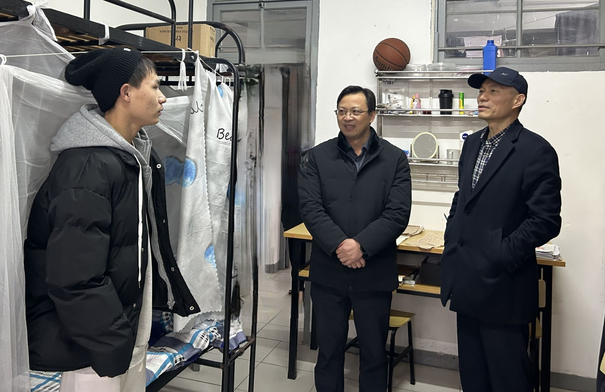 许新海一行来到致知楼111教室,了解经济管理学院国际贸易专业留学生复习备考的情况。许新海和张忠深入留学生宿舍,与他们亲切交流。交流中,领导们饶有兴趣地向多位学生询问来通后的生活感受、寒假的课余安排以及日常起居的相关细节问题。许新海为我校留学生的汉语交流能力频频点赞。张忠叮嘱同学们留校期间注意安全,度过一个平安、快乐、有收获的假期。