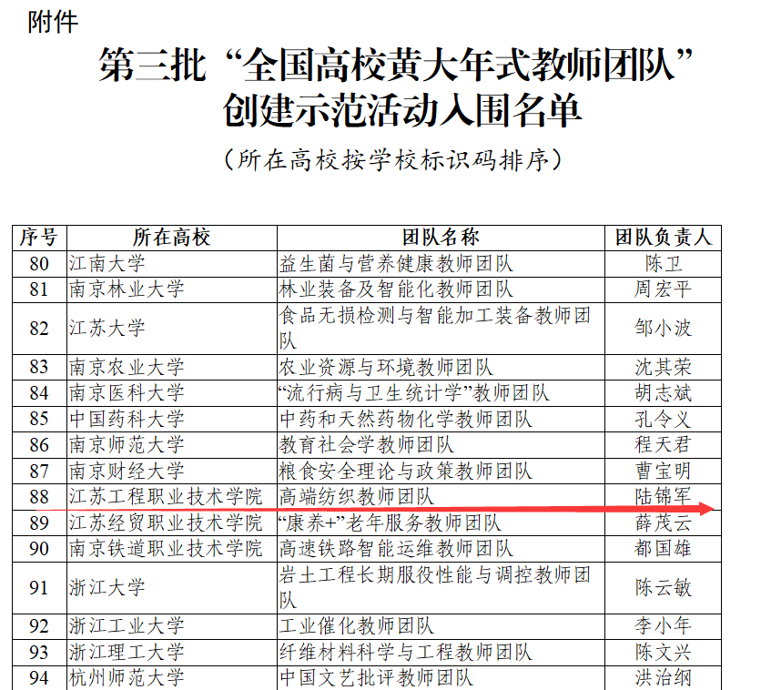 近日,教育部公布了第三批全国高校黄大年式教师团队创建活动评选结果,我校陆锦军教授领衔的高端纺织教师团队成功入选。此次全国共有199个团队入选,其中高职院校30个。