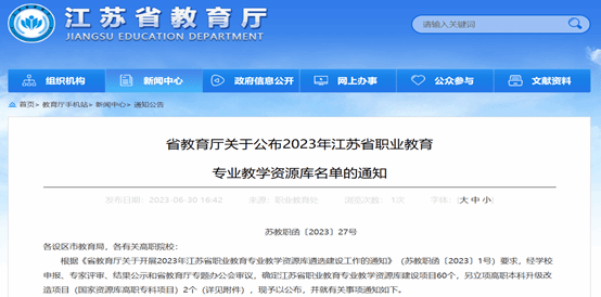 近日,江苏省教育厅发布了《省教育厅关于公布2023年江苏省职业教育专业教学资源库名单的通知》,共有60个高职专科项目获得立项,其中我校航空与交通工程学院的《新能源装备技术》和纺织服装学院的《数字化染整技术》获批立项建设。
