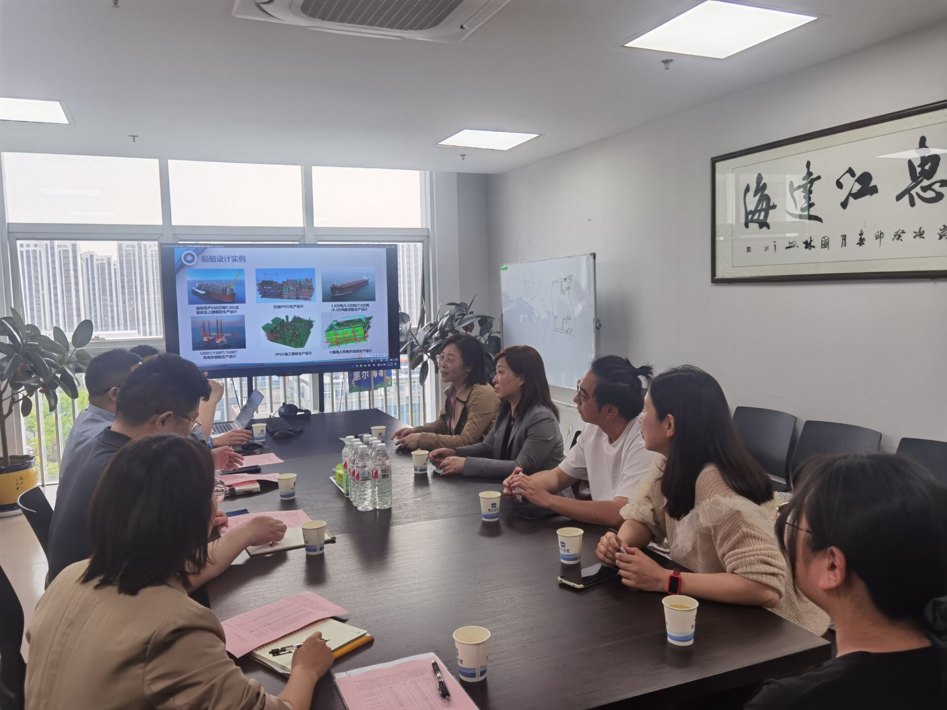 江苏行舟建设工程有限公司副总经理季中均、南通惠尔海事服务有限公司总经理曾广才、南通名志信息技术有限公司总经理陈勇、奇妙创造(南通)文化传播有限公司总经理贺晨阳接待了学校一行,并带大家参观了公司。交流座谈会上,四家单位介绍了公司概况、发展历程、业务版块等。双方围绕产学研合作、人才需求、实习实践等方面进行了交流,并深入探讨了如何进一步做好毕业生就业创业指导工作。