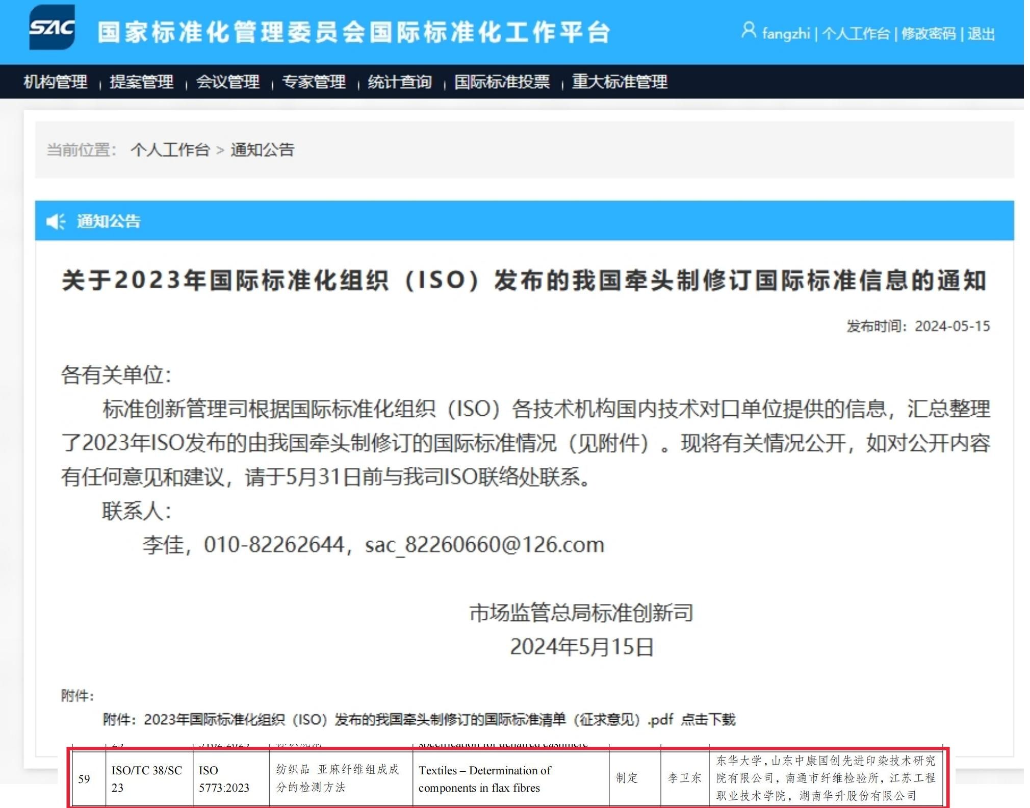 国际标准发布是非常艰辛的过程,从起草、立项、修订、论证到报批发布项目组耗时近5年时间。此标准由东华大学牵头,在制定过程中,我校先进纺织工程技术中心陈志华教授团队发挥重要作用,通过大量科学实验研发,针对亚麻和其他麻类纤维在实际生产和国际贸易中质量控制的需求,凭借丰富的专业知识和实践经验,为标准的制定提供了科学、合理的技术支撑和数据支持。同时,中心团队也积极参与国际交流与合作,与国际同行共同探讨亚麻纤维检测技术的发展趋势和未来方向,推动了这一领域的标准化进程。