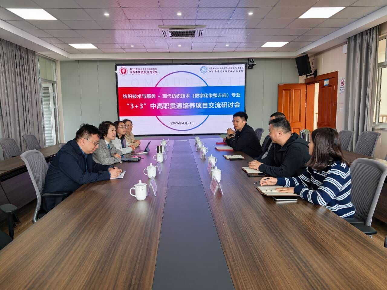 在苏州丝绸中等专业学校,双方就中高职贯通培养开展专题交流。两校共建十余年的3+3中高职贯通项目,已形成成熟的中高职衔接培养体系,育人成效获苏州市委领导肯定。